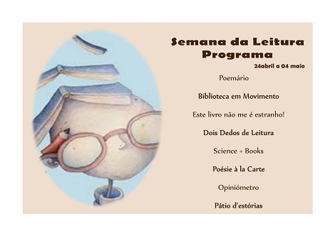 A Equipa da Biblioteca Escolar está a organizar atividades sobre a Semana da Leitura — "Prazer de Ler” que terão lugar de 24 abril a 4 maio, nas Bibliotecas da Escola EBI de Colares, e em que participarão alunos, pessoal docente, pessoal não docente e famílias.