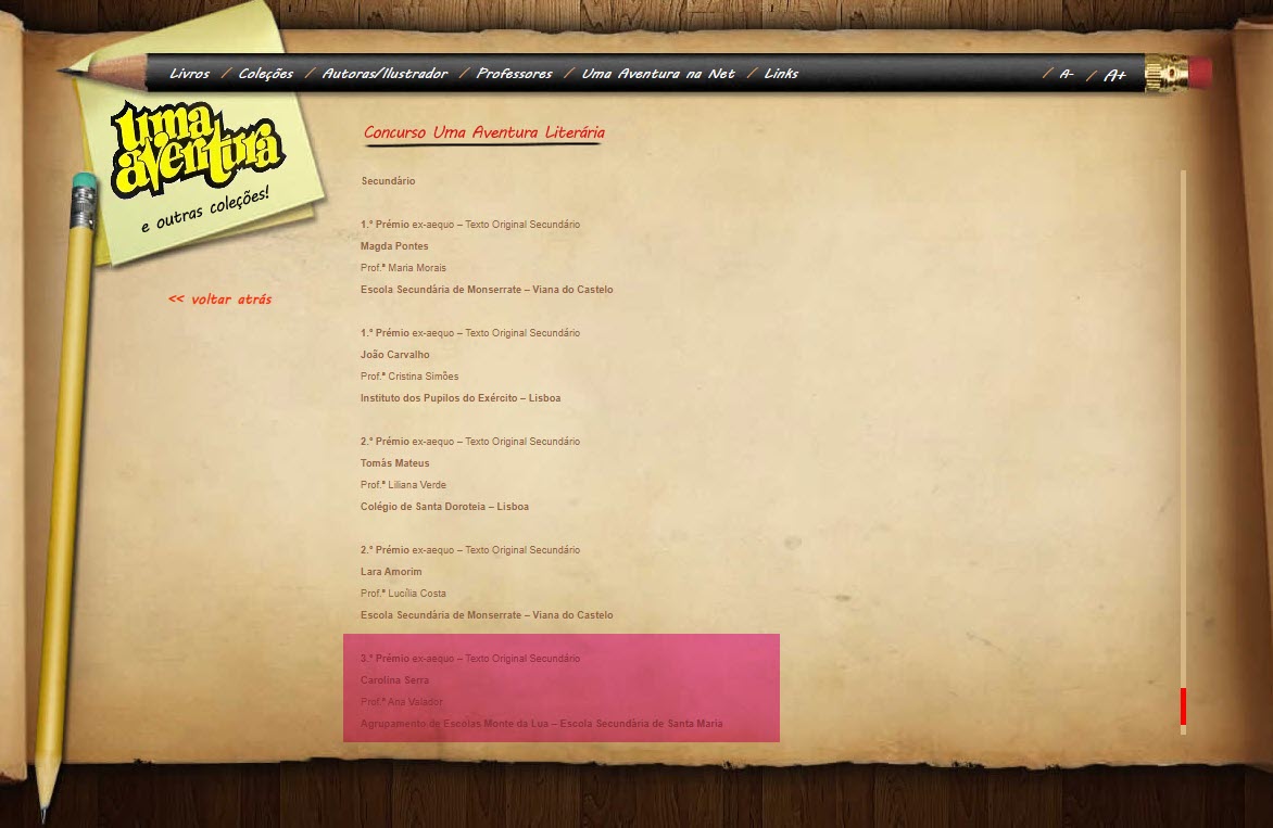 A nossa aluna, Carolina Serra, do 10º J, ficou em 3º lugar, categoria texto original, no concurso Uma Aventura Literária 2021, promovido pela Editorial Caminho, num universo superior a 11 mil participantes de todo o país e também das escolas que lecionam português no estrangeiro.