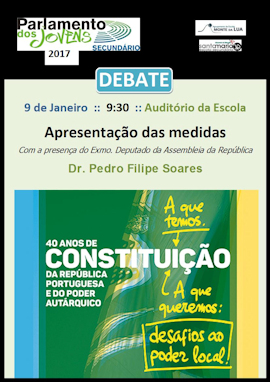 No próximo dia 9 de janeiro, pelas 9h 30, decorrerá a apresentação das medidas propostas pelos nossos alunos no âmbito da participação no projeto do Parlamento dos Jovens, este ano subordinado ao tema “A Constituição que temos, a Constituição que queremos: desafios ao poder local”, que contará com a presença do Exmo Deputado da Assembleia da República, Dr. Pedro Filipe Soares.